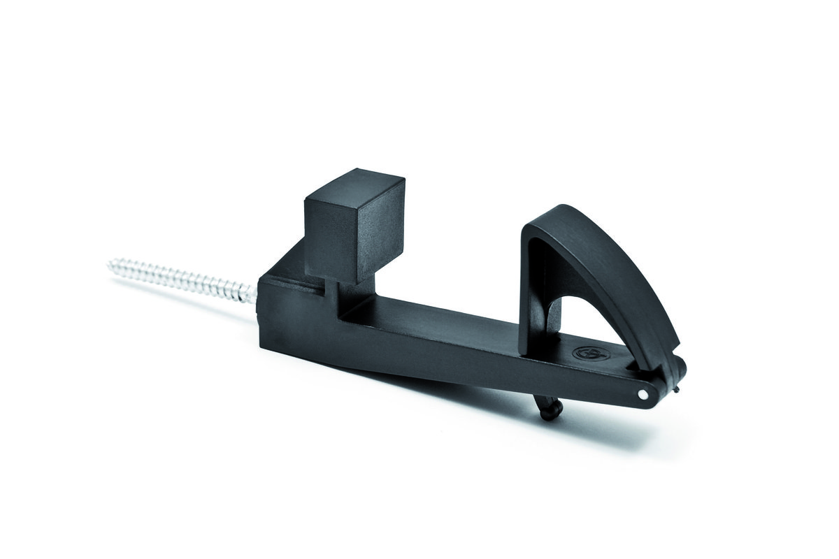 Manual shutter stopper by Esinplast for single-panel shutters, installed outside the building envelope, with panel slot adjustable to between minimum 46 mm and maximum 54 mm.